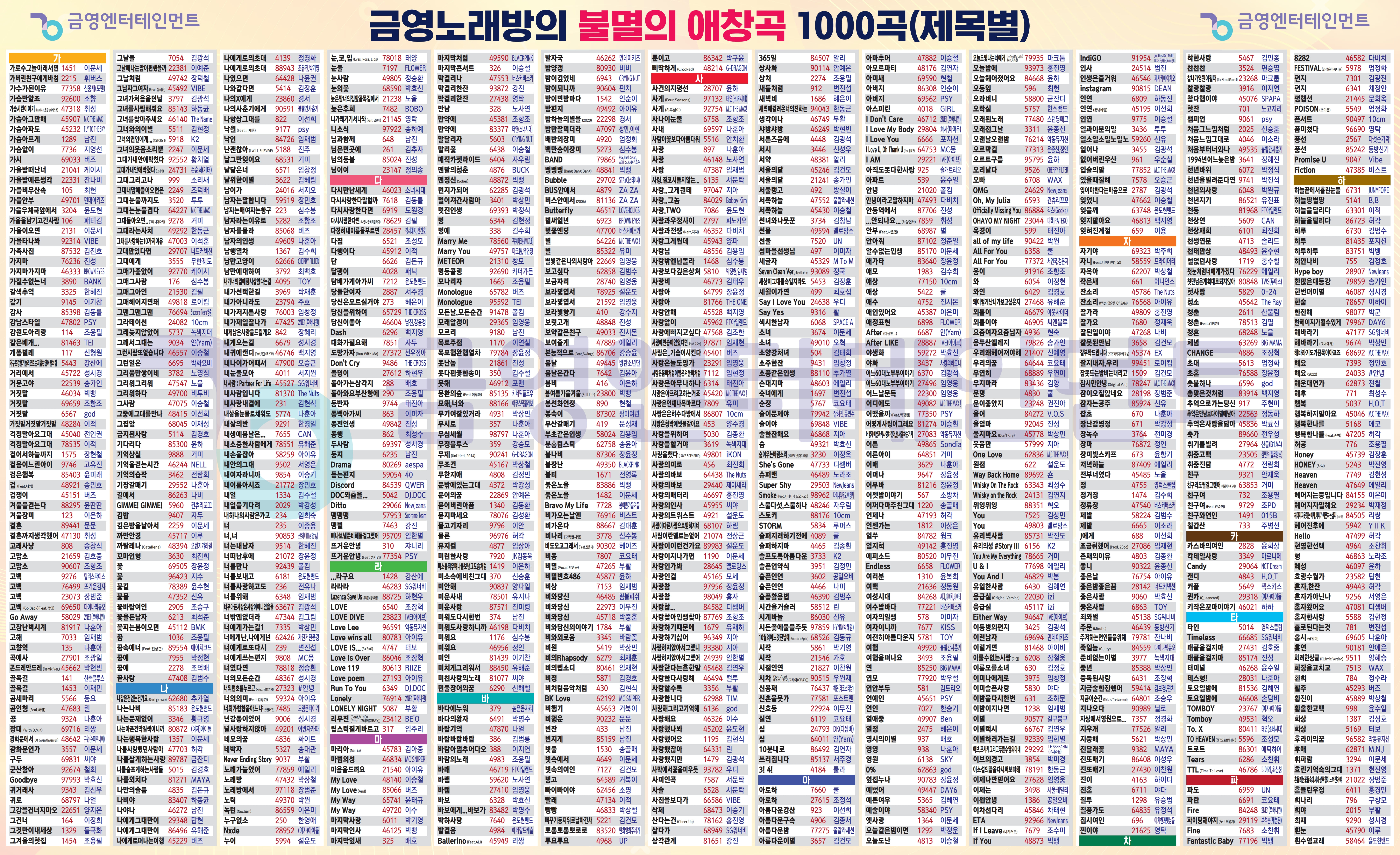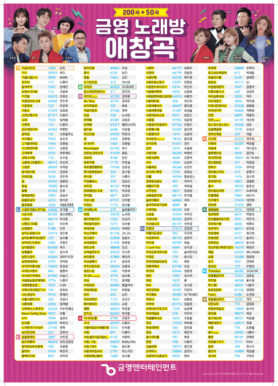 오늘 포스팅에서는 각각 금영, TJ 노래방에서 가장 인기가 많은 애창곡 리스트를 준비했습니다. 각 노래방 별 애창곡 리스트와 포스터는 아래에서 확인해주세요 :)