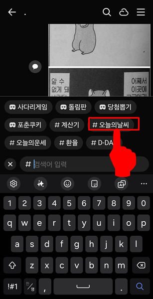 4. 검색창에 '날씨'라고 입력하거나, 미리 등록된 #오늘의 날씨를 선택합니다.