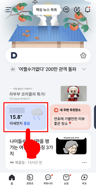 다음(Daum) 앱을 사용한다면 검색창 아래에서 날씨 정보를 빠르게 확인할 수 있습니다.