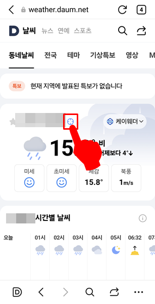 3. 주소 옆 아이콘을 클릭하면 현재 위치 날씨로 변경이 됩니다.